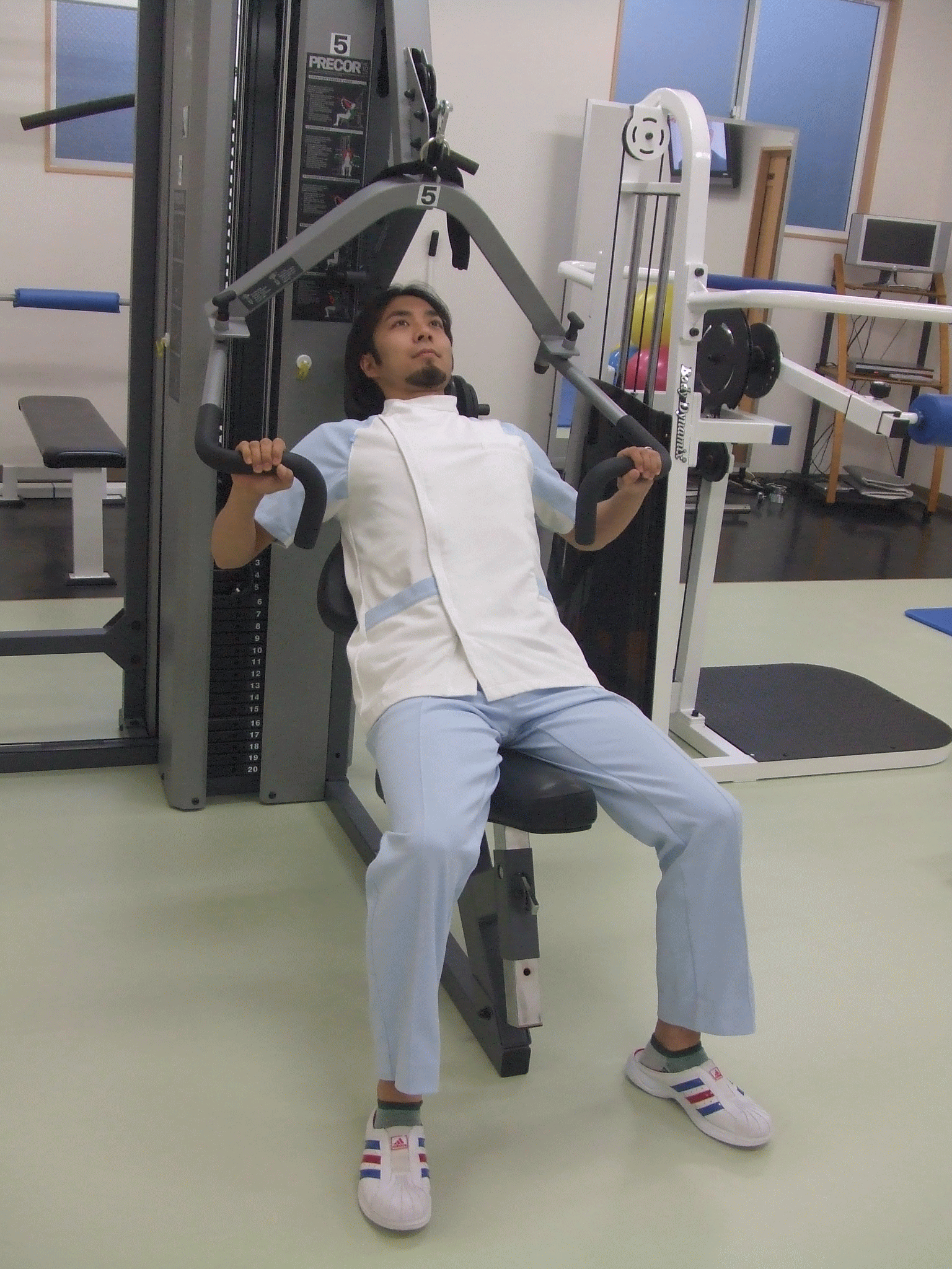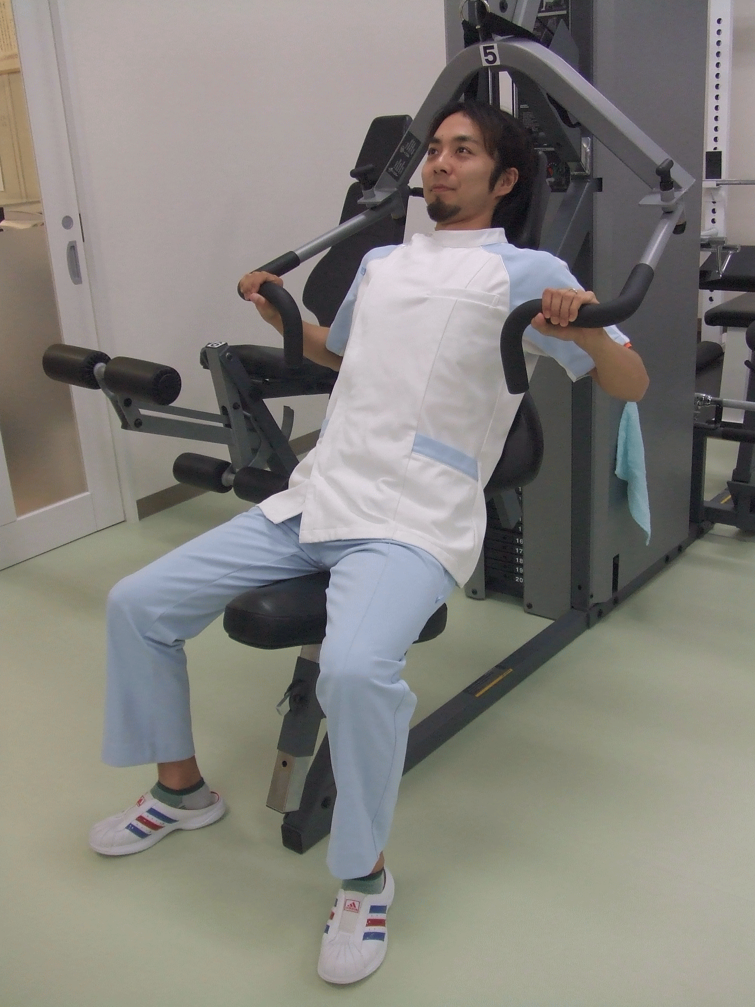 Benchとの違いは、アームをプッシュする角度が若干下がることで同じ大胸筋のエクササイズでも鍛える位置が変わります。 背もたれとアームの角度を@にセットします。しっかり腰掛けたら頭を後ろのパッドにつけたまま軽く胸を張り、息を吐きながら腕を前に突き出します。戻すときは腕を突き出した速さの倍時間をかけてゆっくり戻します。 |